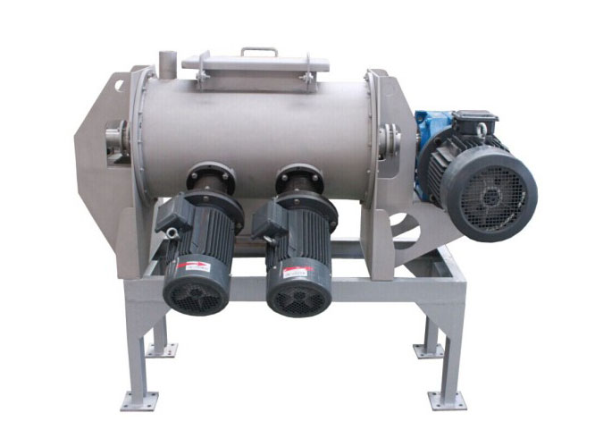 臥式犁刀混合機的傳動部分是由電機、擺線針輪減速機、聯軸器、犁刀軸等部件組成。臥式圓筒體作盛物料用,筒體上開有若干孔,供進出料、觀察用。犁刀軸支承座固定在筒體二端的蓋板上。犁刀組由犁刀、犁刀臂和主軸組成,犁刀由犁刀臂安裝在主軸上,并作成哈夫結構,便于拆裝。飛刀組由多把飛刀組成,通過電機直接驅動,安裝在筒體側面。出料閥裝在筒體的底部(連續出料除外),用于關閉和放出物料?;旌蠙C噴液裝置固定在筒體上方,噴嘴采用農用噴頭,噴散好。